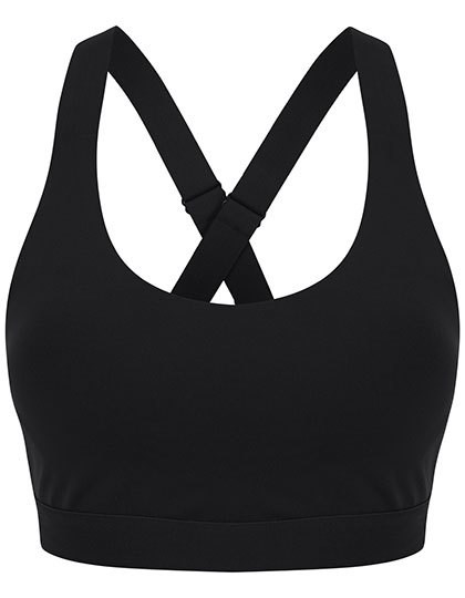 Sport-BH mit mittlerem Halt | Rundhals | Überkreuzte elastische Rückenträger | Verstellbare Schieber an den Trägern | Elastischer Bund | BH-Verschluss | Feste Körbchen | Abreißetikett