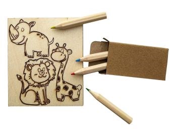 Nach Lust und Laune ausmalen. 3 lustige Tiermotive gelasert auf einer 3mm Birkensperrholzplatte (naturbelassen), die auch herausgebrochen werden können. Inklusvie 4-teiligen Buntstiftset. Verpackt in einer Papiertüte. Maße 9,1 x 7,7cm. VE 200/1 Stück.