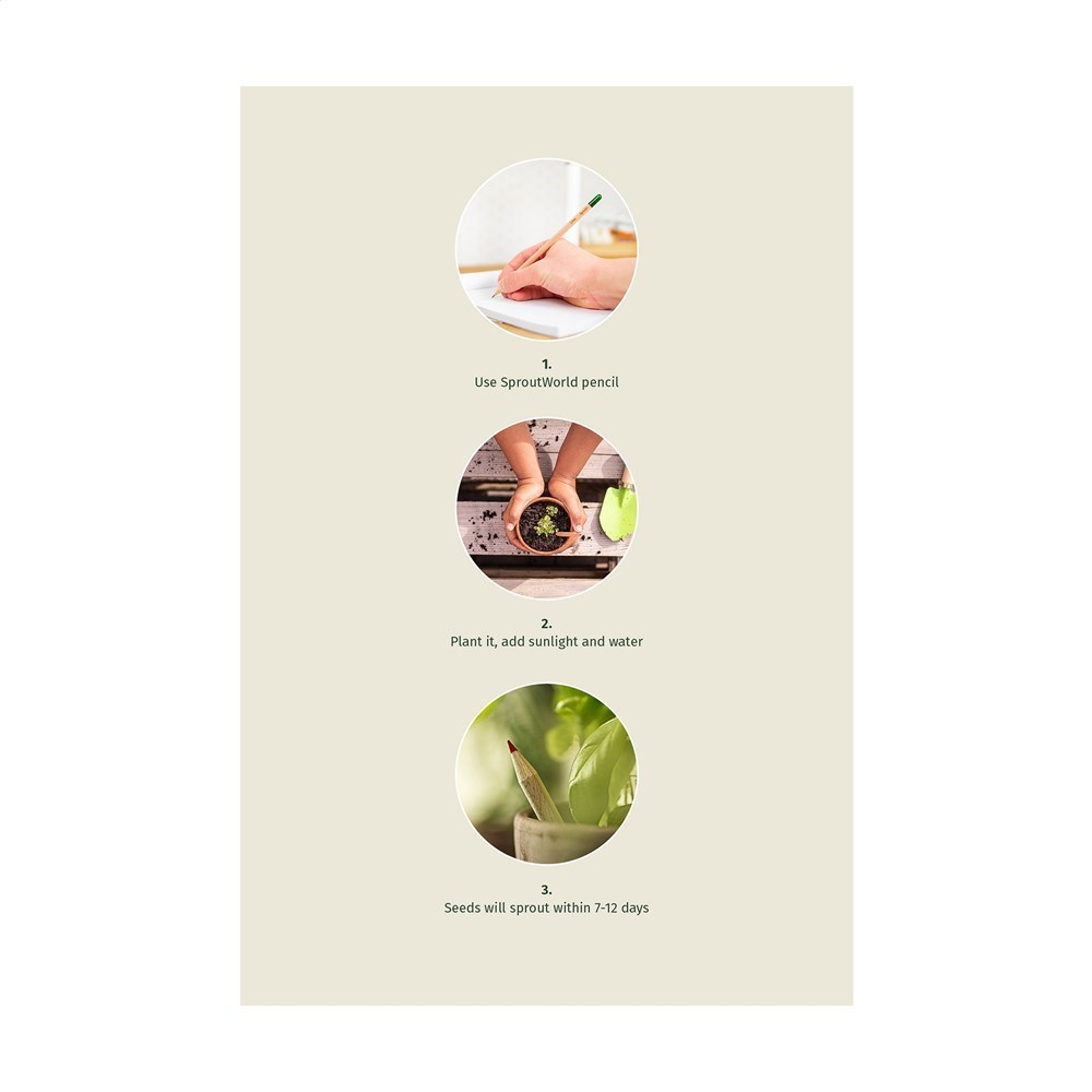 Sproutworld-Bleistift mit einer inspirierenden Botschaft für die Natur. Dieser angespitzte Bleistift ist aus Holz gefertigt. Am Ende des Bleistifts ist eine Kapsel (aus Zellulose) angebracht, die einige Samen enthält. Wenn der Stift zu klein geworden ist, um ihn zu verwenden, pflanzen Sie den Stift mit der Kapsel in die Erde. Nach etwa 2–3 Wochen keimen die Samen und entwickeln sich zu wunderschönen Blumen, duftenden Kräutern oder Gemüse. Wählen Sie aus verschiedenen Typen. Der Name der Pflanze ist standardmäßig in den Bleistift eingraviert. Der Bleistift enthält kein Blei und ist daher völlig sicher. Made in Europe. Zusatzartikel W387: Bunte Karte aus Karton zum Einlegen des Bleistifts. Die Karte enthält englischsprachige Informationen über das Produkt und verleiht dem Produkt einen exklusiven Aufmerksamkeitswert. Eine Life Cycle Assessment (LCA) dieses Produkts ist bei den Downloads verfügbar.