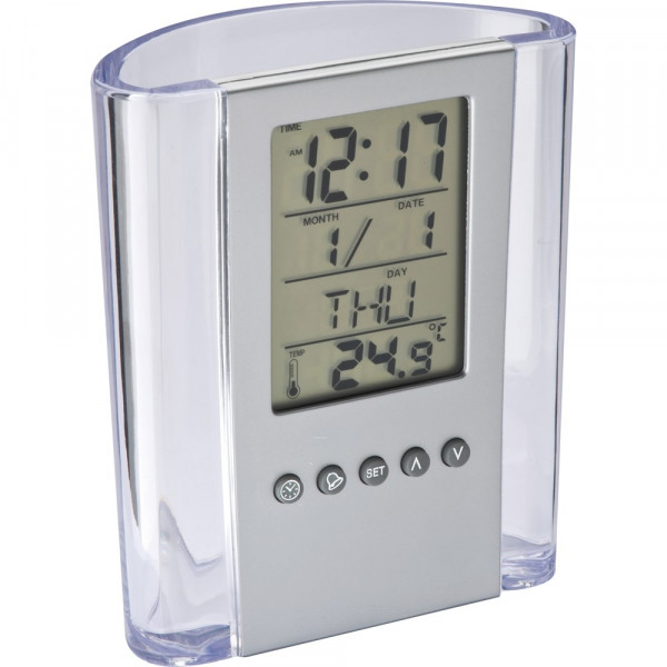 Unser Acrylschreibtischköcher mit integrierter Uhr und verschiedenen Funktionen ist ein vielseitiges und stilvolles Accessoire für den Schreibtisch. Dieser Köcher verfügt über eine Uhr mit Alarmfunktion, Datumsanzeige, Wochentaganzeige und Temperaturanzeige.