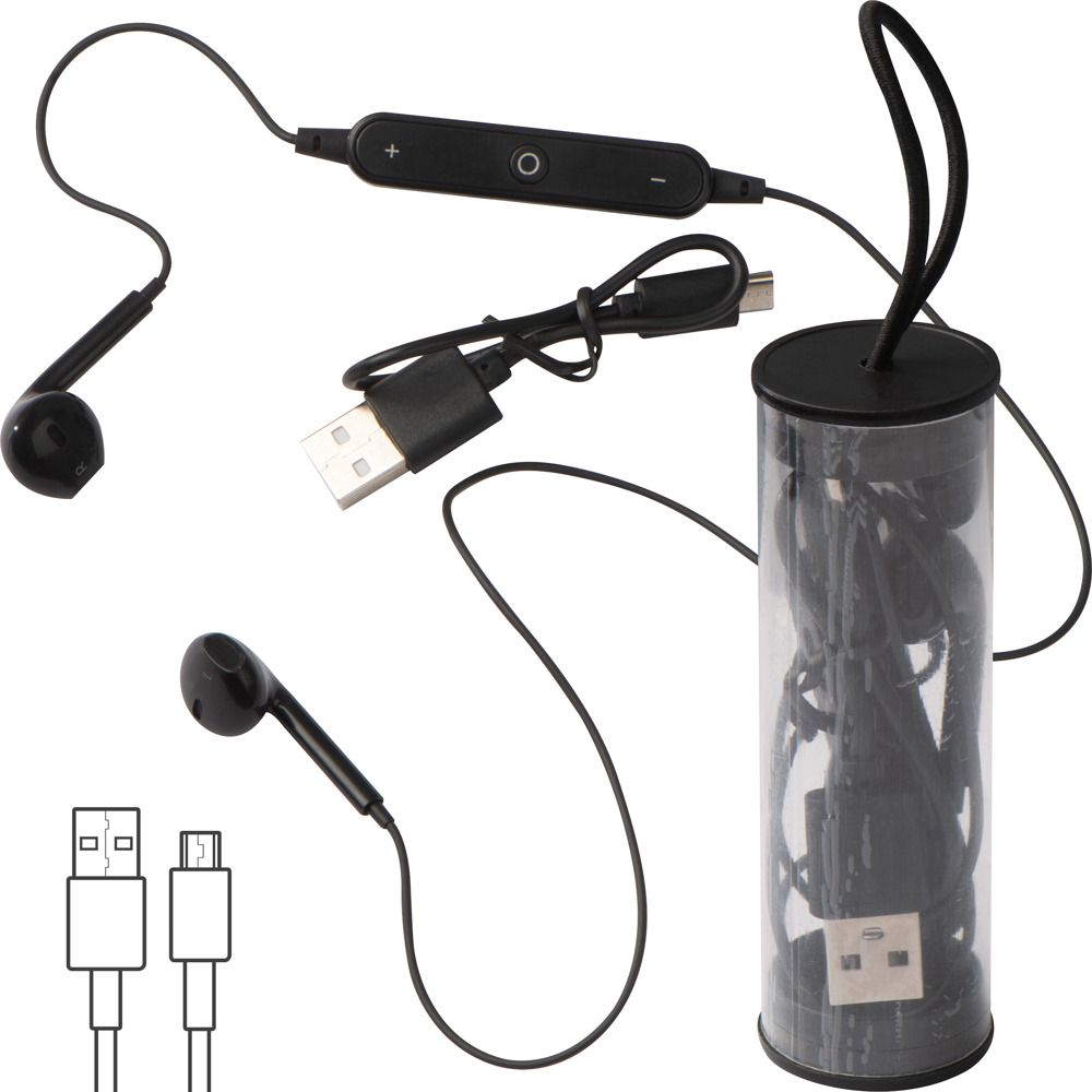 Bluetooth Kopfhörer mit Lautstärkeregulierung und USB-Ladekabel in einer Kunststoffverpackung mit Hängeschlaufe. Ihre Werbung wird auf die Verpackung gedruckt.