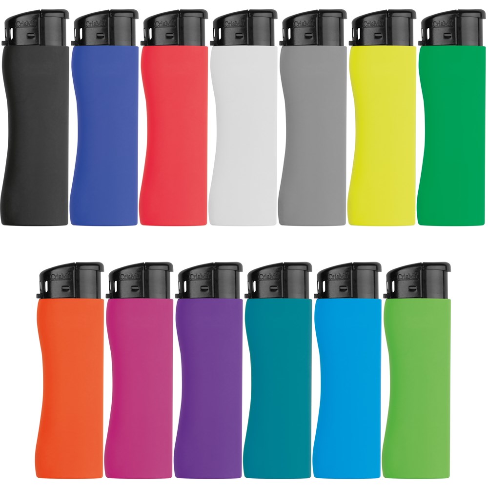Ergonomisch geformtes Elektronikfeuerzeug mit gummierter Oberfläche, nachfüllbar. Die Flamme lässt sich stufenlos verstellen. Der Werbeaufdruck wird im Digitaldruck (mehrfarbig) für Rechtshänder lesbar angebracht.