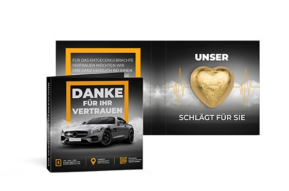 Werbeklappkarte individuell beidseitig bedruckt mit innenliegendem Lindt Herz aus Vollmilchschokolade (rot oder gold).