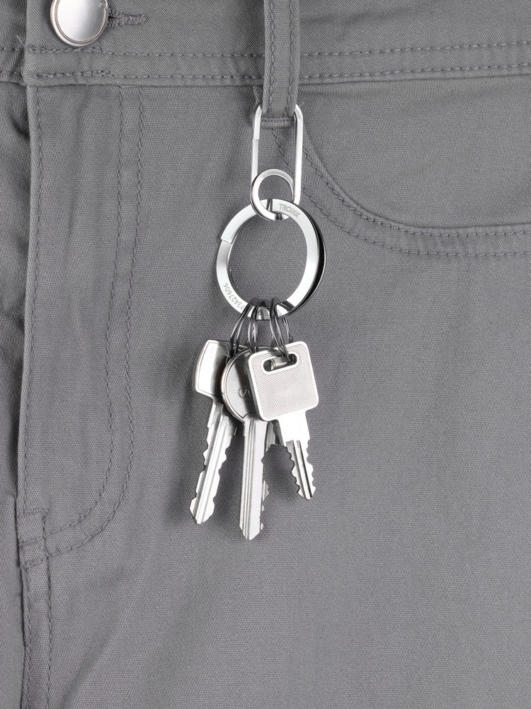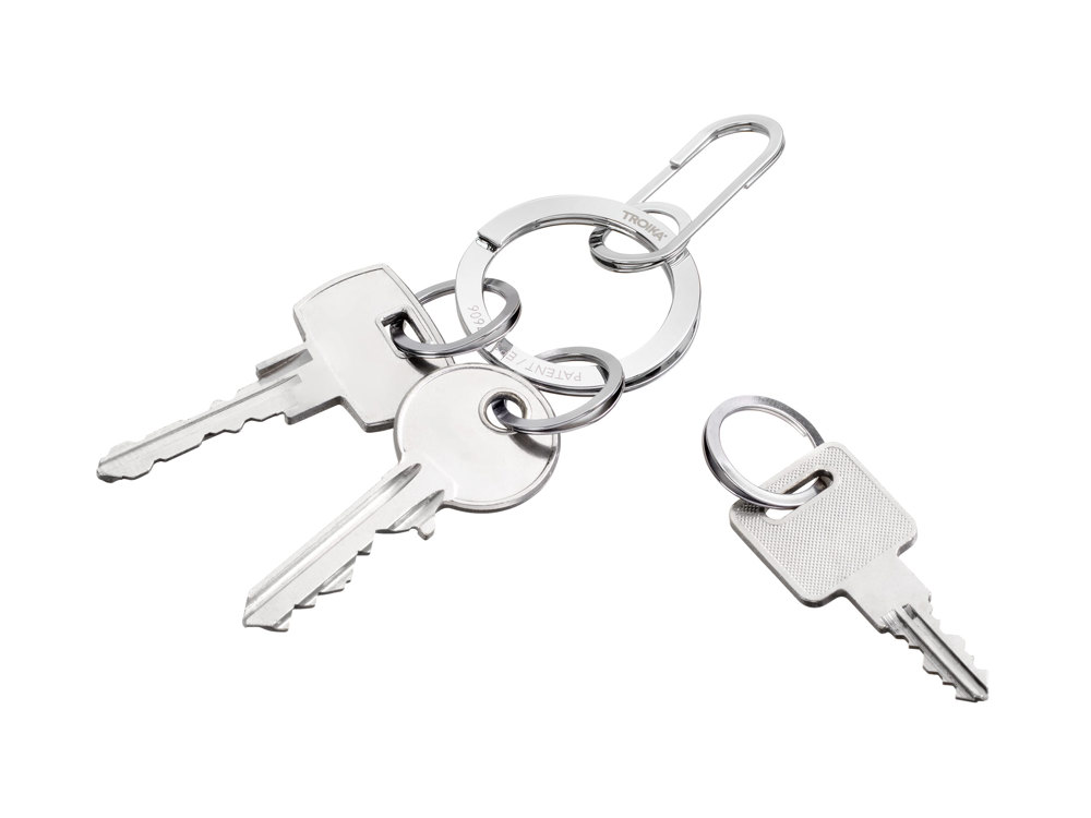 Schlüsselanhänger mit Karabinerhaken, inkl. 3 kleiner Ringe, schnelles & einfaches Anbringen der Schlüssel dank patentiertem Öffnungsmechanismus (TROIKA NAIL GUARD), fingernagelschonend, Edelstahl, verchromt, glänzend, silberfarben