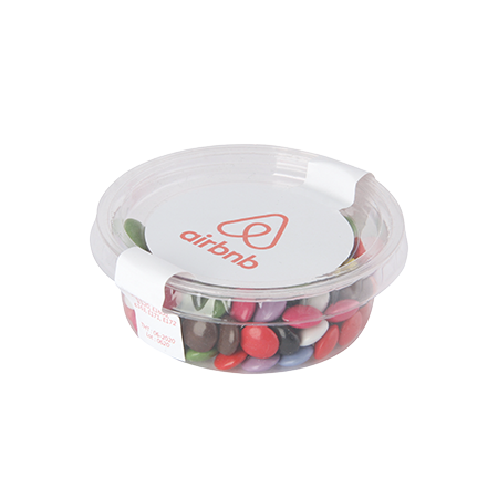 Transparenter biologisch abbaubarer Becher mit separatem Deckerl, Ø 70 x 26 mm., Füllung 40 gr. Schokocarletties und Jelly Beans
