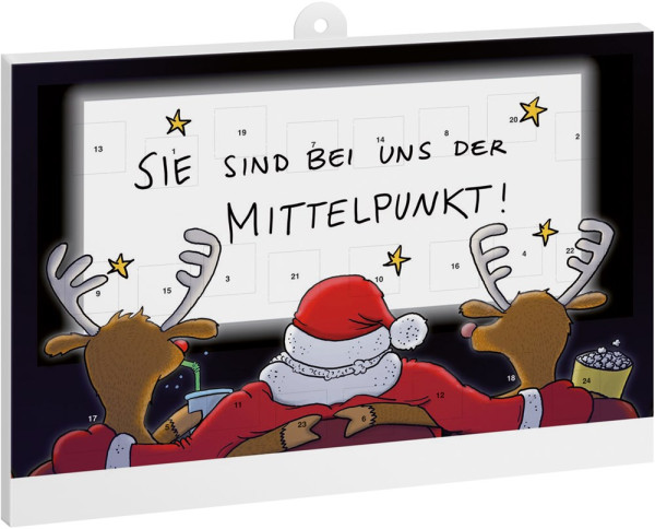 Wand-/Tisch-Adventskalender im Hoch- oder Querformat mit stabilem Inlay aus 100 % abbaubaren Rohstoffen, 24 Türchen gefüllt mit Vollmilchschokolade, 3-fach verklebt, mit personalisierbarem Standardmotiv.