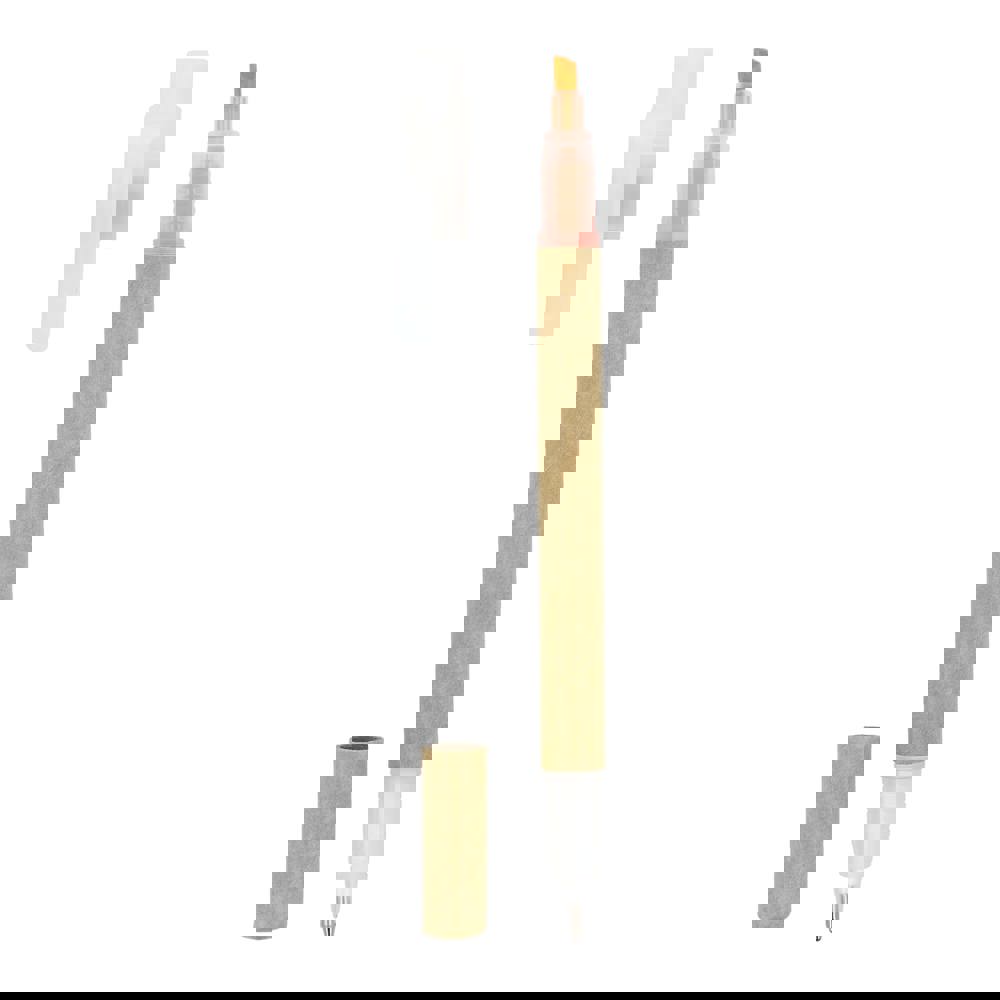Textmarker in Kombination mit einem Kugelschreiber. Der Textmarker ist in verschiedenen Schreibfarben erhältlich und der Kugelschreiber hat eine blaue Mine.