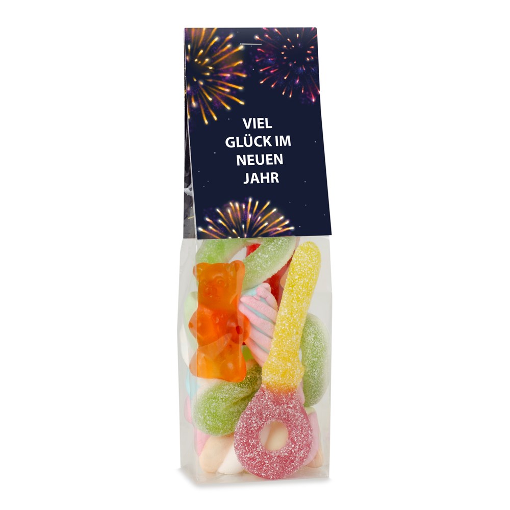 Eine süße Portion Neujahrs-Süßigkeiten. Der süße Neujahrskracher für Groß und Kleinim individualisierten Geschenkbeutel.