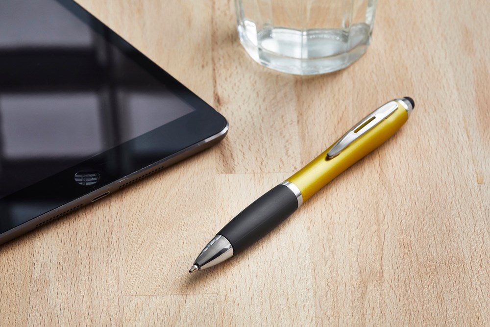 Kugelschreiber aus Kunststoff, mit Drehfunktion, Metall-Clip, gummierter Griffzone, Touchpen und schwarzer Mine.