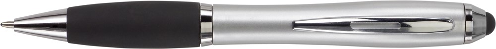Kugelschreiber aus Kunststoff, mit Drehfunktion, Metall-Clip, gummierter Griffzone, Touchpen und schwarzer Mine.