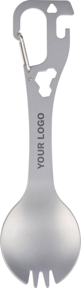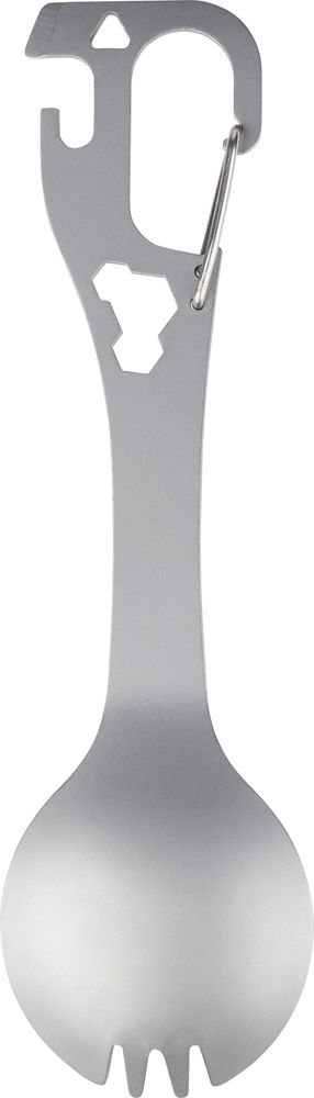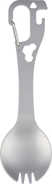 Edelstahl-Göffel mit integrierter Gabel und Löffel, flachem Schraubendreher, Flaschen- und Dosenöffner sowie drei Inbusschlüsseln im Schaft. Mit Karabinerhaken. Einzeln verpackt in einer Papiertüte.