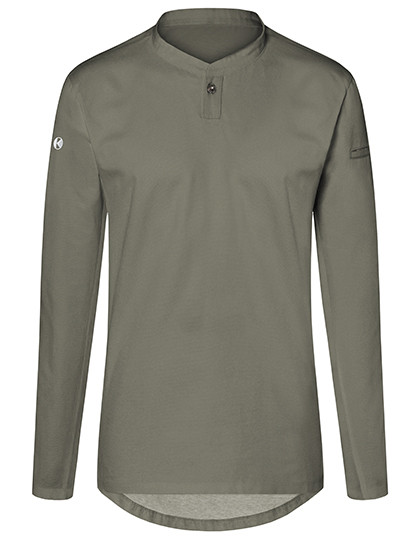 Vorderseite: Köpergewebe | Rückseite: Jersey-Piqué, atmungsaktiv, feuchtigkeitsregulierend | Lange Ärmel | Tailliert geschnitten | Halsausschnitt mit schmalem Stehkragen und kleiner Knopfleiste | Leistentasche am linkem Ärmel