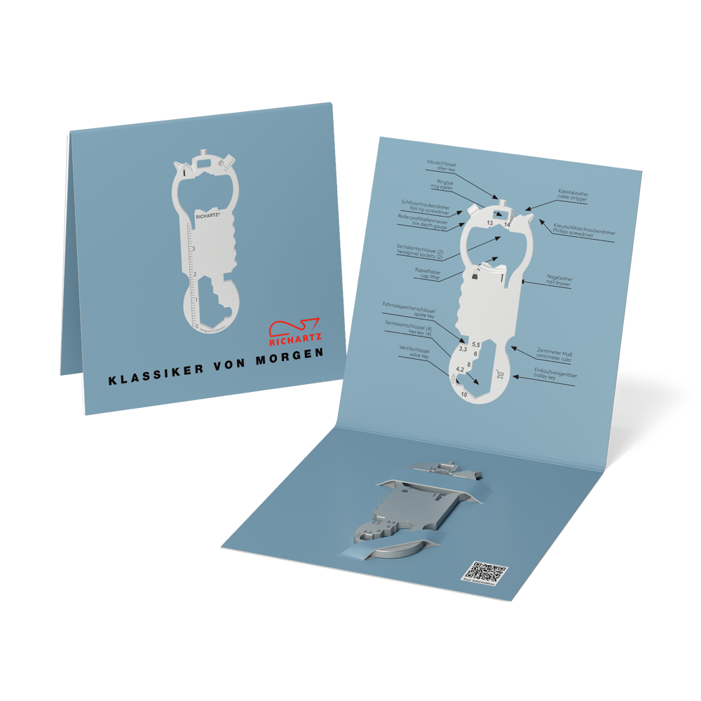 RICHARTZ® KEY TOOL bike ist der erfolgreiche Werbeträger für Marken und Unternehmen. Mit einer individuellen Lasergravur und individuell gestalteter 4-seitigen Verpackung in 4c, werben Marken aufmerksamkeitsstark und aussagekräftig!