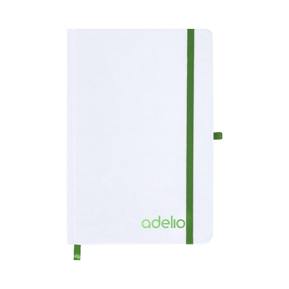 Notizblock mit steifen weißen Einbänden aus recyceltem Karton. Innenraum mit 80 verfügbaren Blättern für einen Streifen. Enthält ein Lesezeichen, in derselben Farbe wie elastisches Verschlussband und Stifthalter. Spezial für Lasergravuren, die die ausgewählte Farbe zeigt.