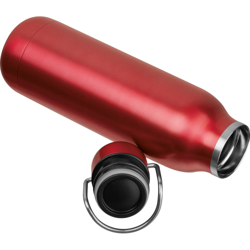 Doppelwandige Vakuum Trinkflasche aus Edelstahl mit Tragegriff am Deckel und einem Fassungsvolumen von 600 ml. Ihre Werbung bringen wir mittels einer Lasergravur auf der Flasche an.