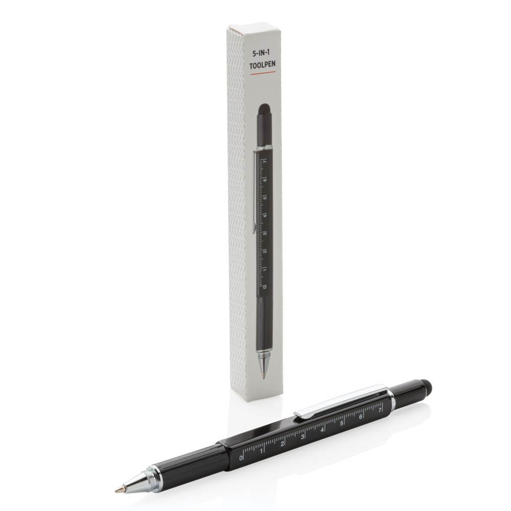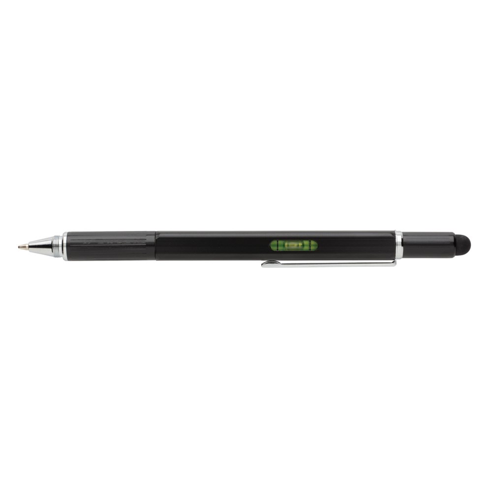 Multifunktionsstift - 400m blauschreibend - mit Skalierung ( 7cm), Wasserwaage, Schraubendreher, Stylus-Spitze. Aus Messing mit Aluminiumclip.